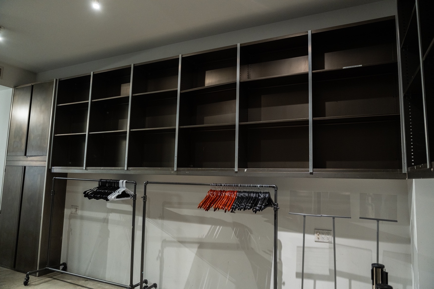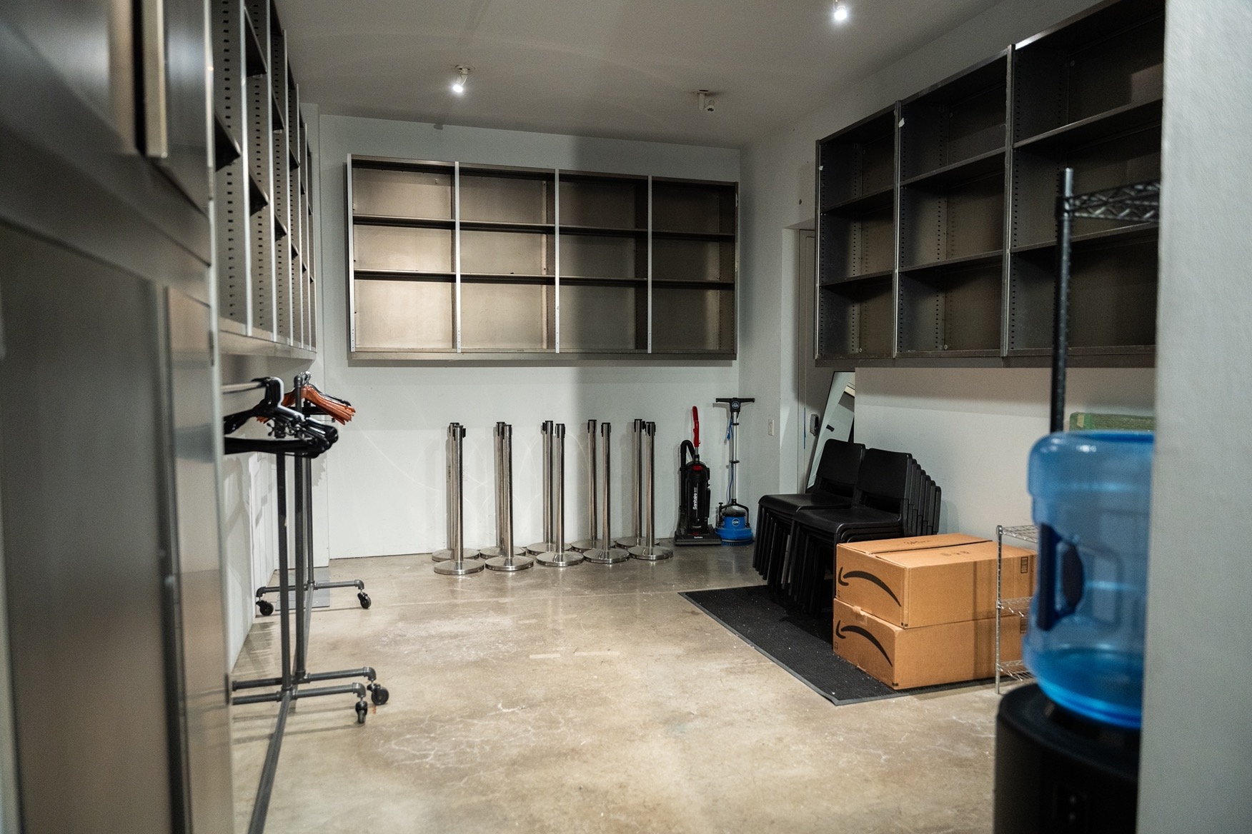 Studio 525 offers ground-floor, street-level load-in with oversized 11.5’ x 11.5’ entry doors, allowing vehicles and large-scale installs to move directly into the space. The front doors are fully brandable with vinyl, pop-out exterior builds, and blade sign takeovers for a powerful street-level presence. A spacious coat check includes coat racks, storage shelves, and is large enough to double as an extra back office right by the front door.