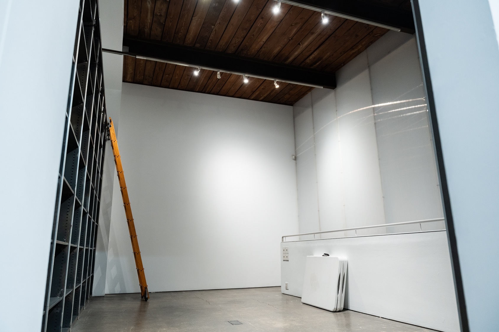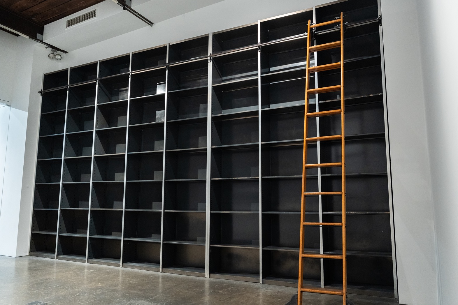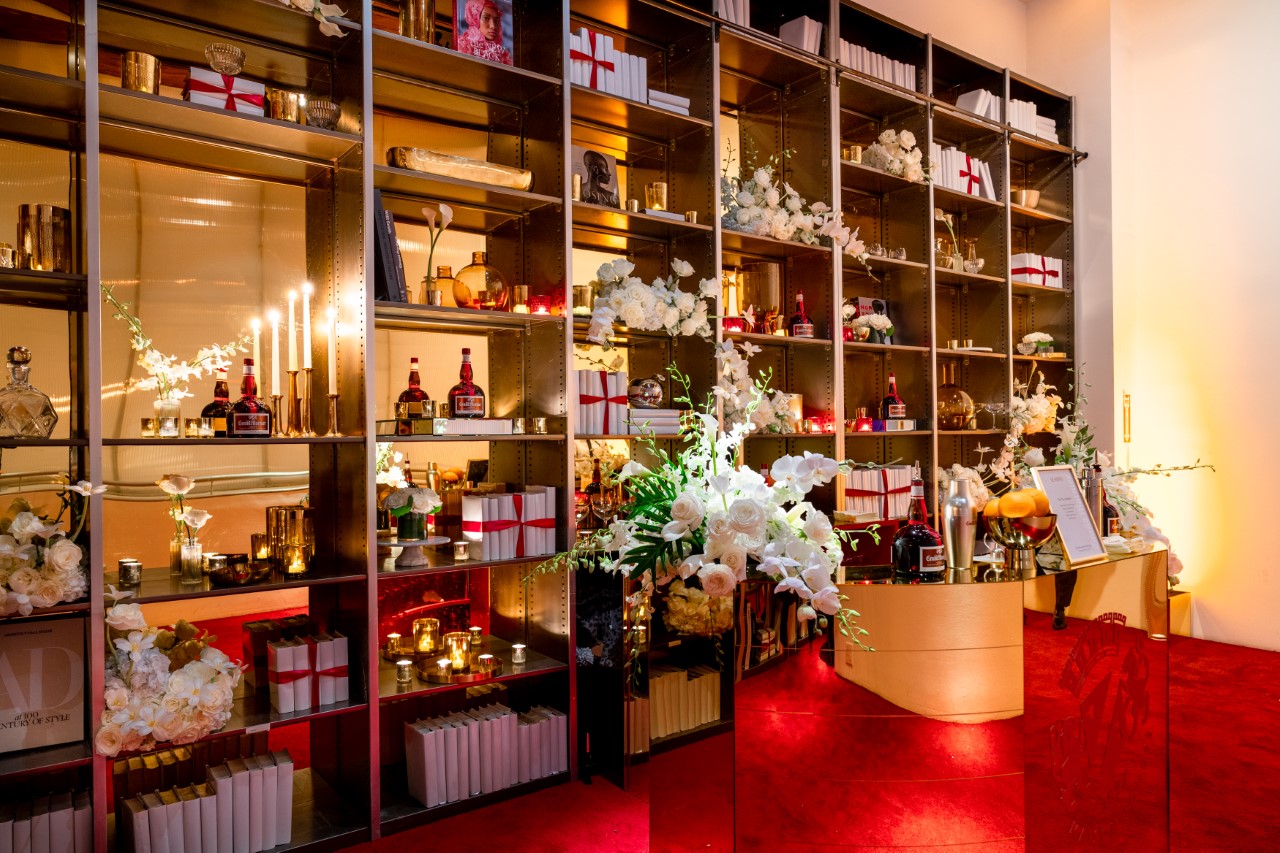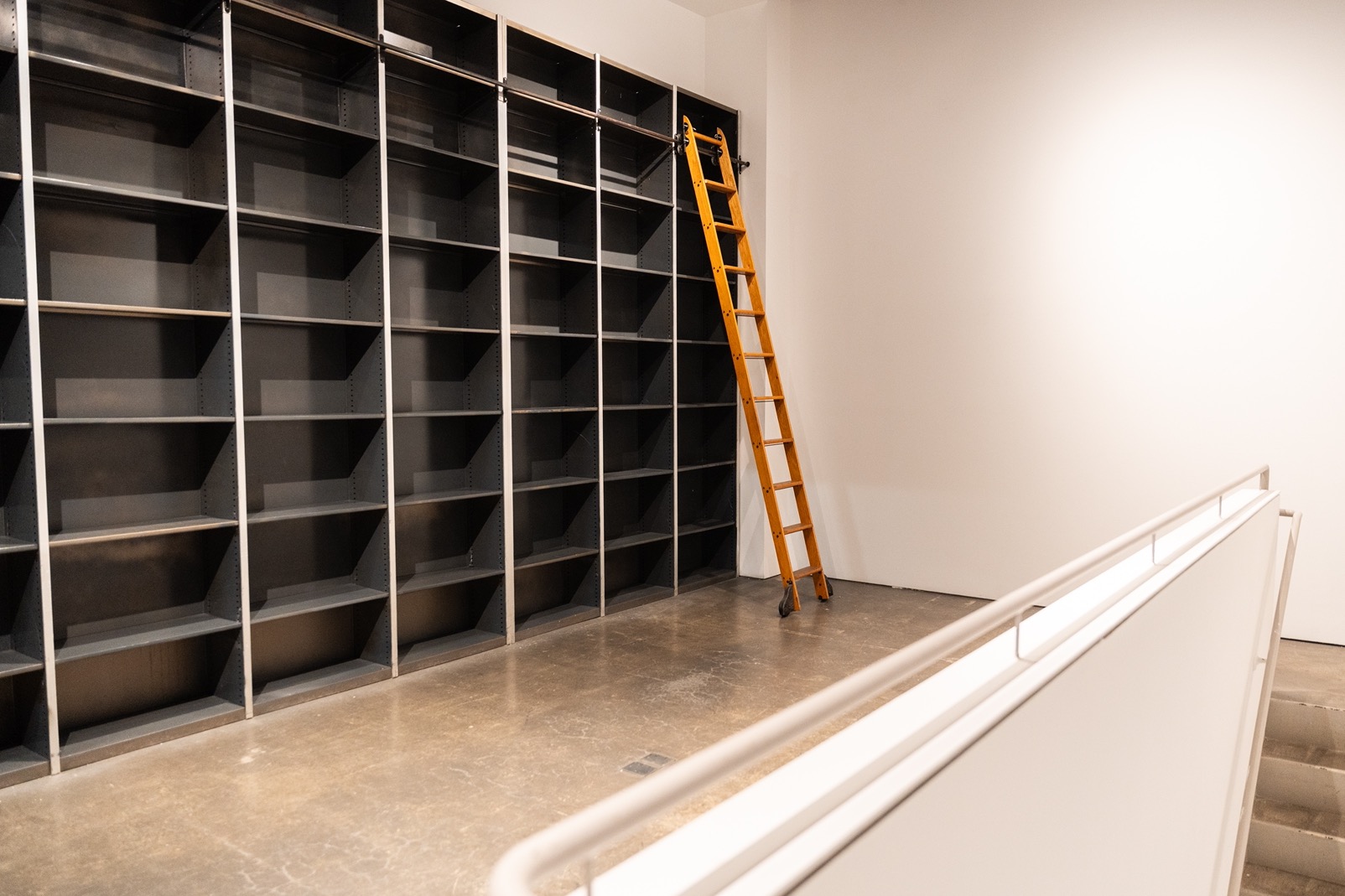 The Library is an elevated mezzanine space with customizable shelving, perfect for press, VIP moments, or back-of-house storage.