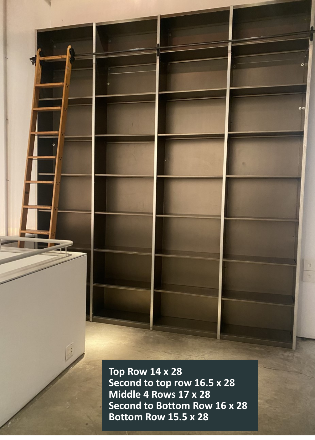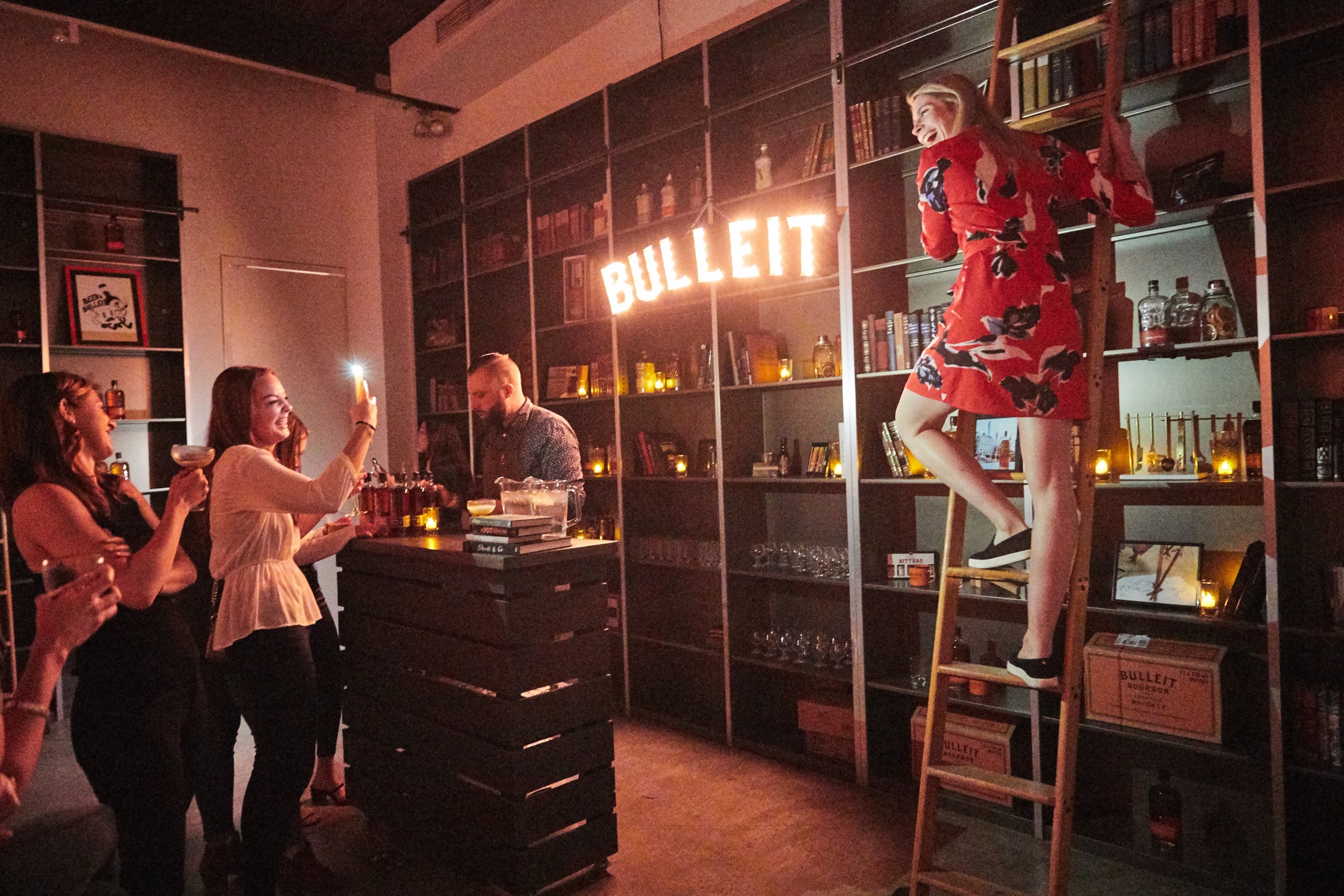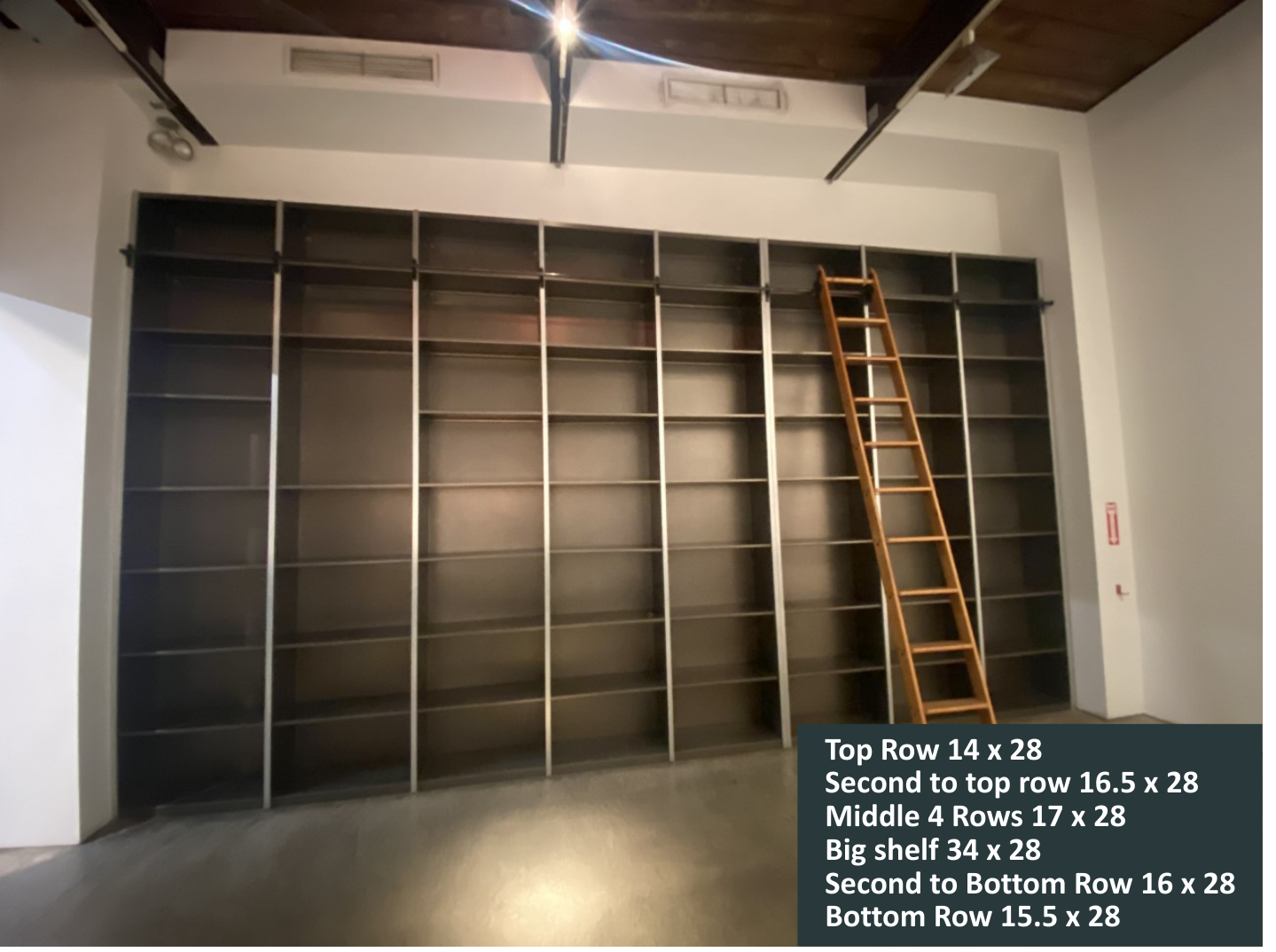 The Library is an elevated mezzanine space with customizable shelving, perfect for press, VIP moments, or back-of-house storage.